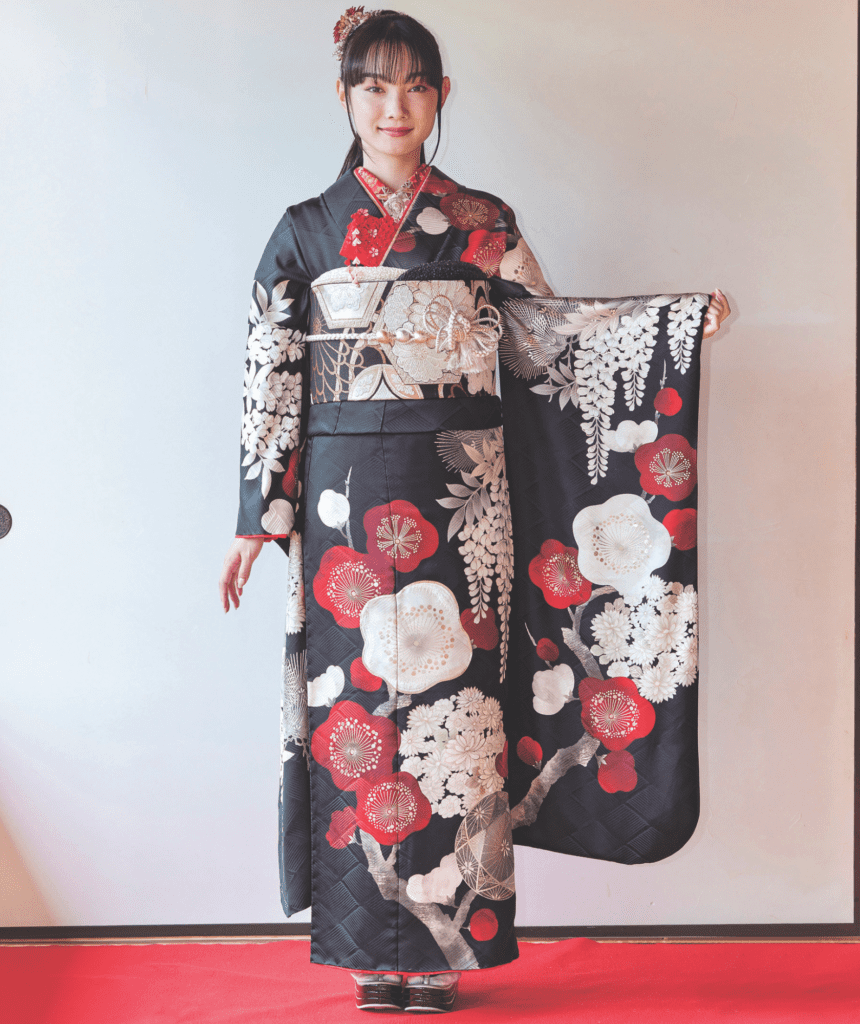 深い赤が特徴の紅梅は、華やかな振袖にぴったりです!