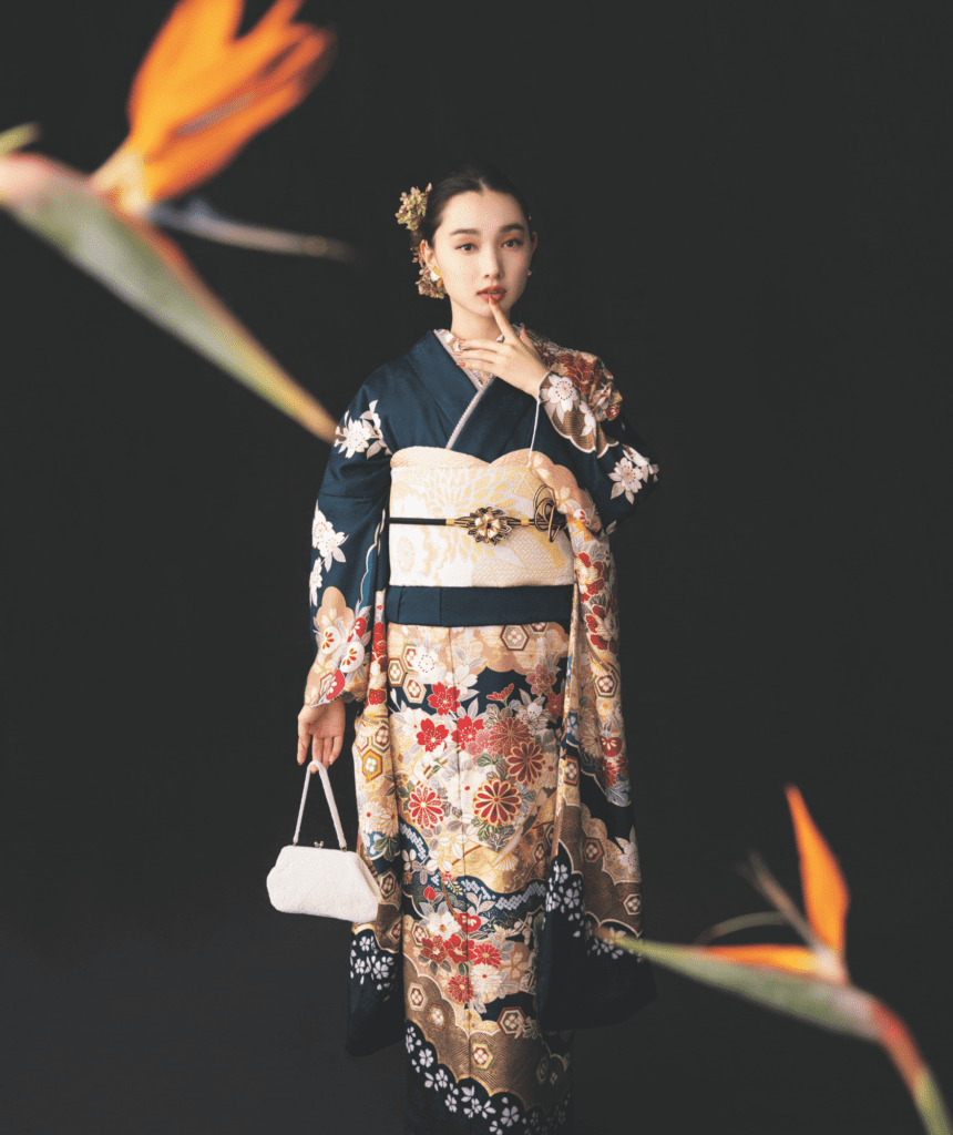 差し色使いなら、振袖の柄の中の差し色と同系色を選ぶのがおすすめです。