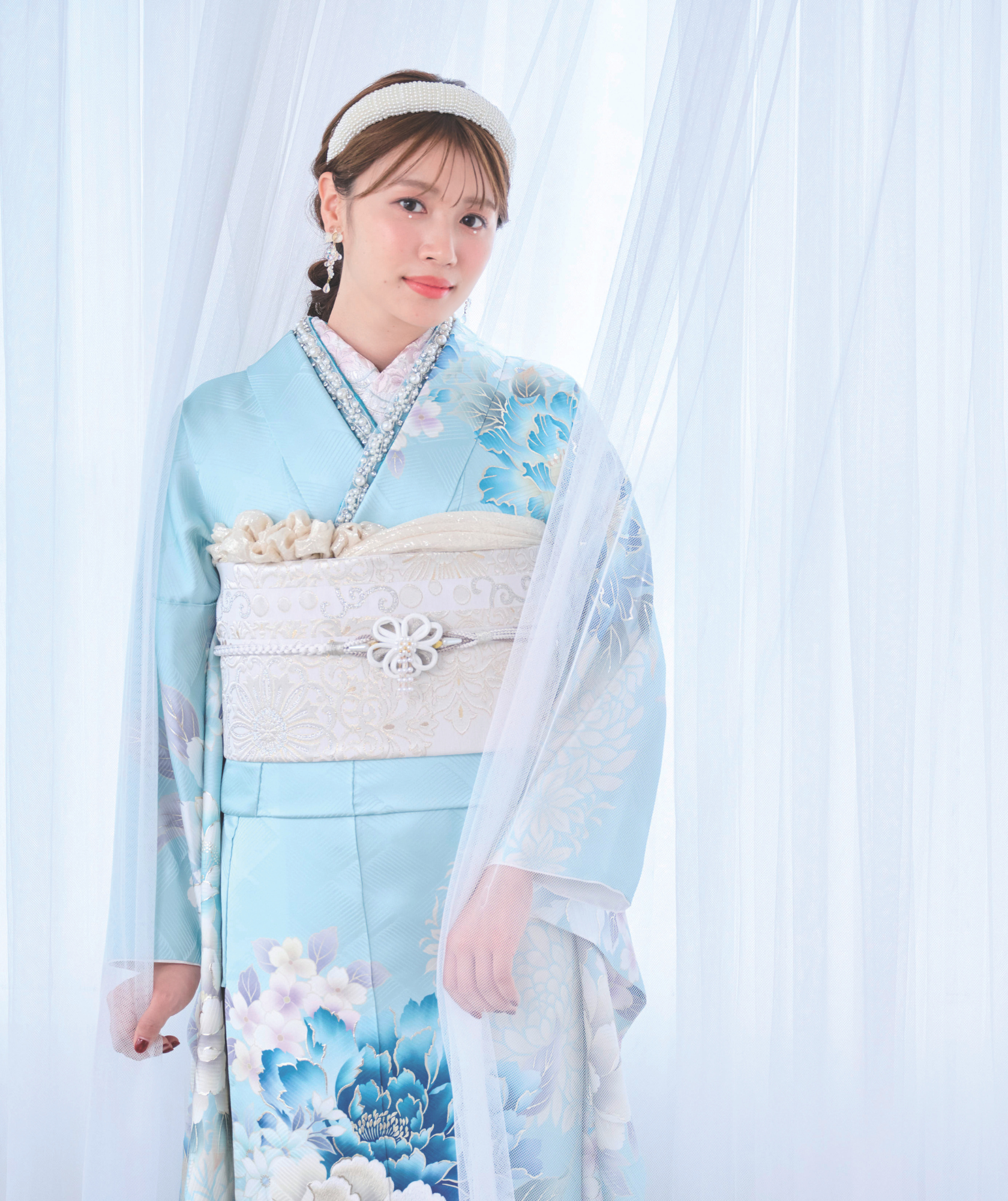 スパンコールが織り込まれた豪華な帯、ビジューたっぷりの髪飾り…と、「キラキラ」を主役にするなら、「ふわひら」要素は「帯揚げをオーガンジーにするだけ」など、ワンポイントに留めましょう。