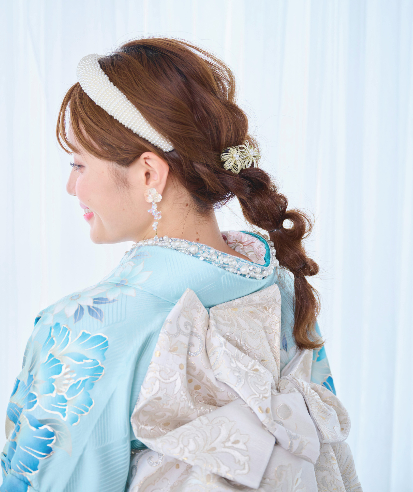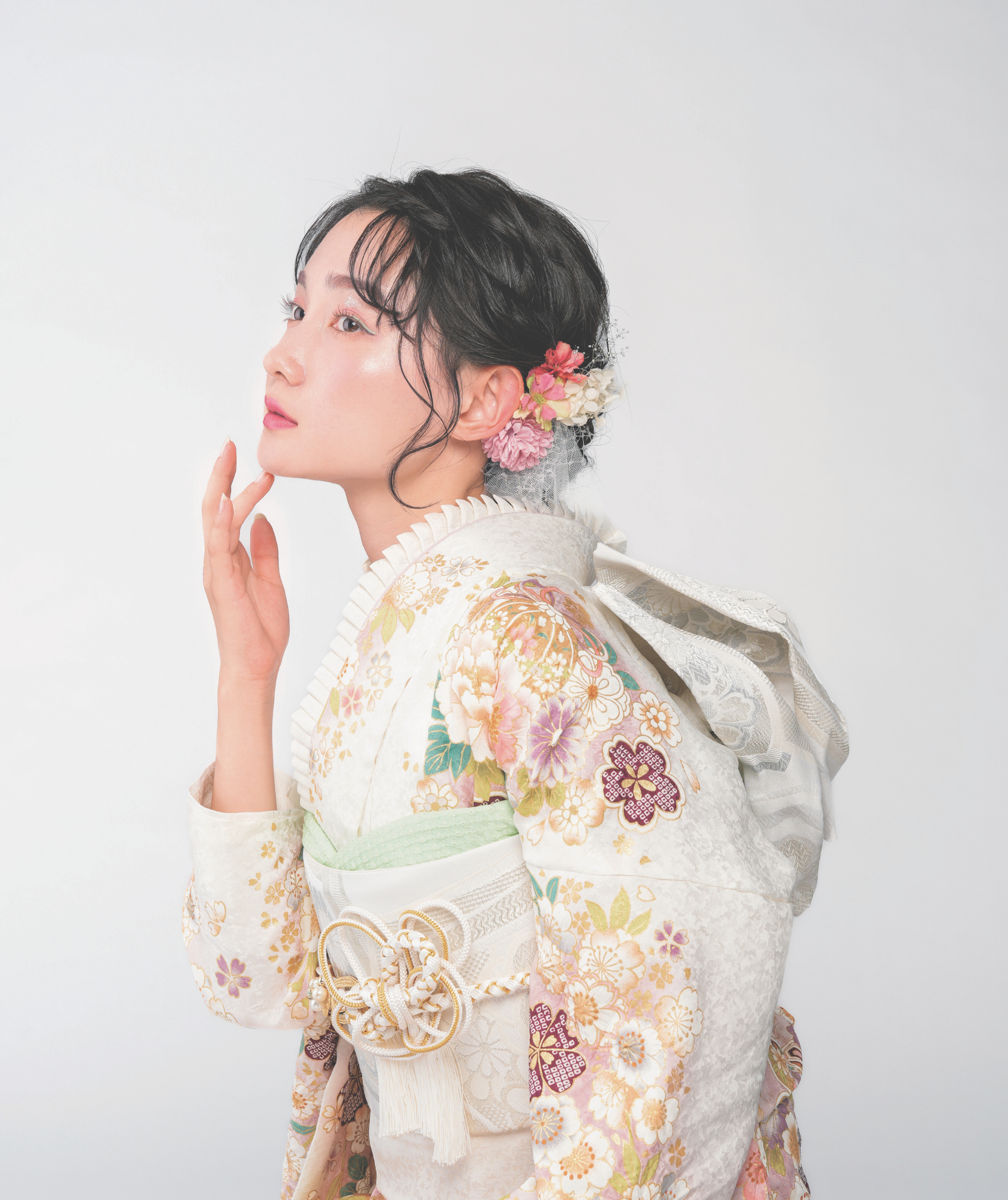 ヘアスタイルで「可憐なオーラ」を作り、メイクで「透明感」を底上げし、そして最後に運命の一着である振袖を纏う。