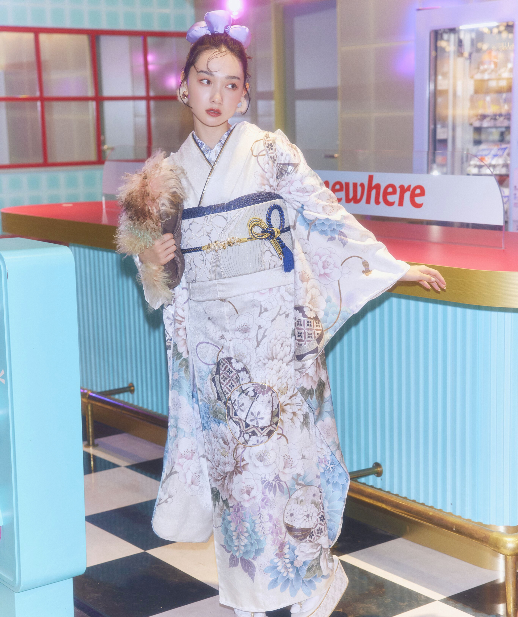 生活感あふれる日常の風景の中に、豪華絢爛な振袖姿で立つという「違和感」が、写真に強いインパクトを与えます。