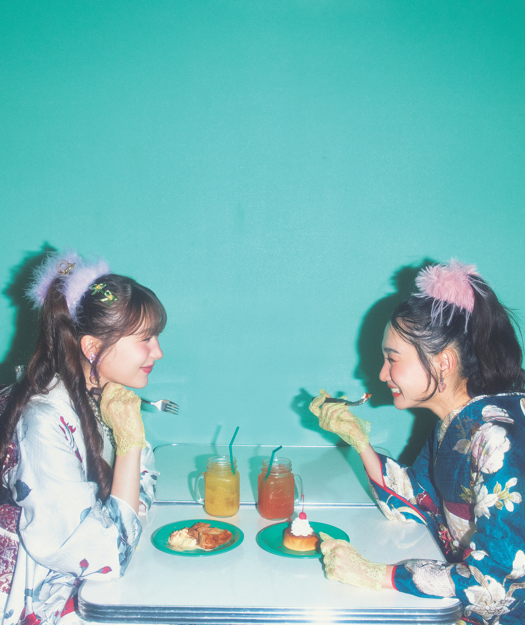 鮮やかなメロンソーダの緑と、振袖の赤やピンクとのコントラストは絶妙です。