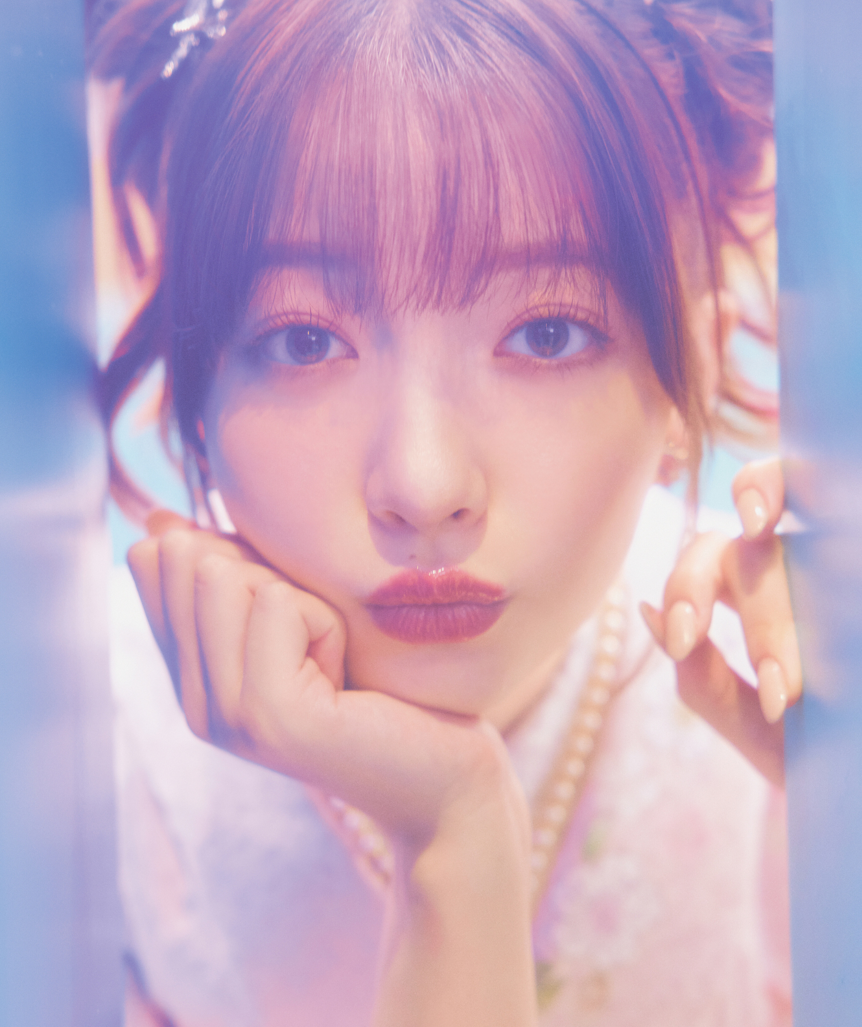 最近人気の淡色系振袖には、濃い色を使わず、ミルクティーのような淡いブラウンやコーラルで、ふんわりと囲む「色素薄い系メイク」がおすすめ。