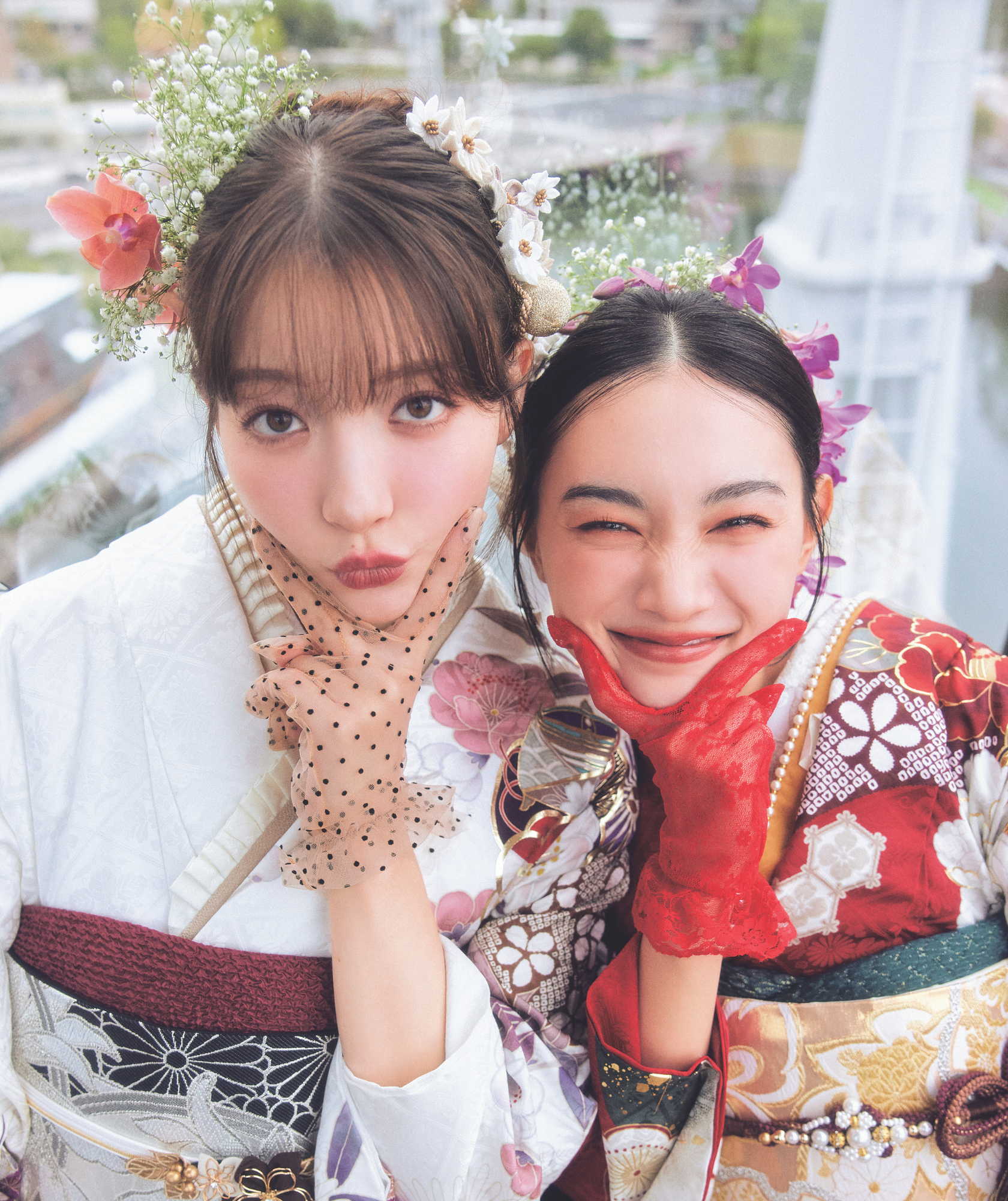 王道の赤やピンクの振袖には、同系色のボルドーやピンクブラウンで囲むのがベストマッチ。